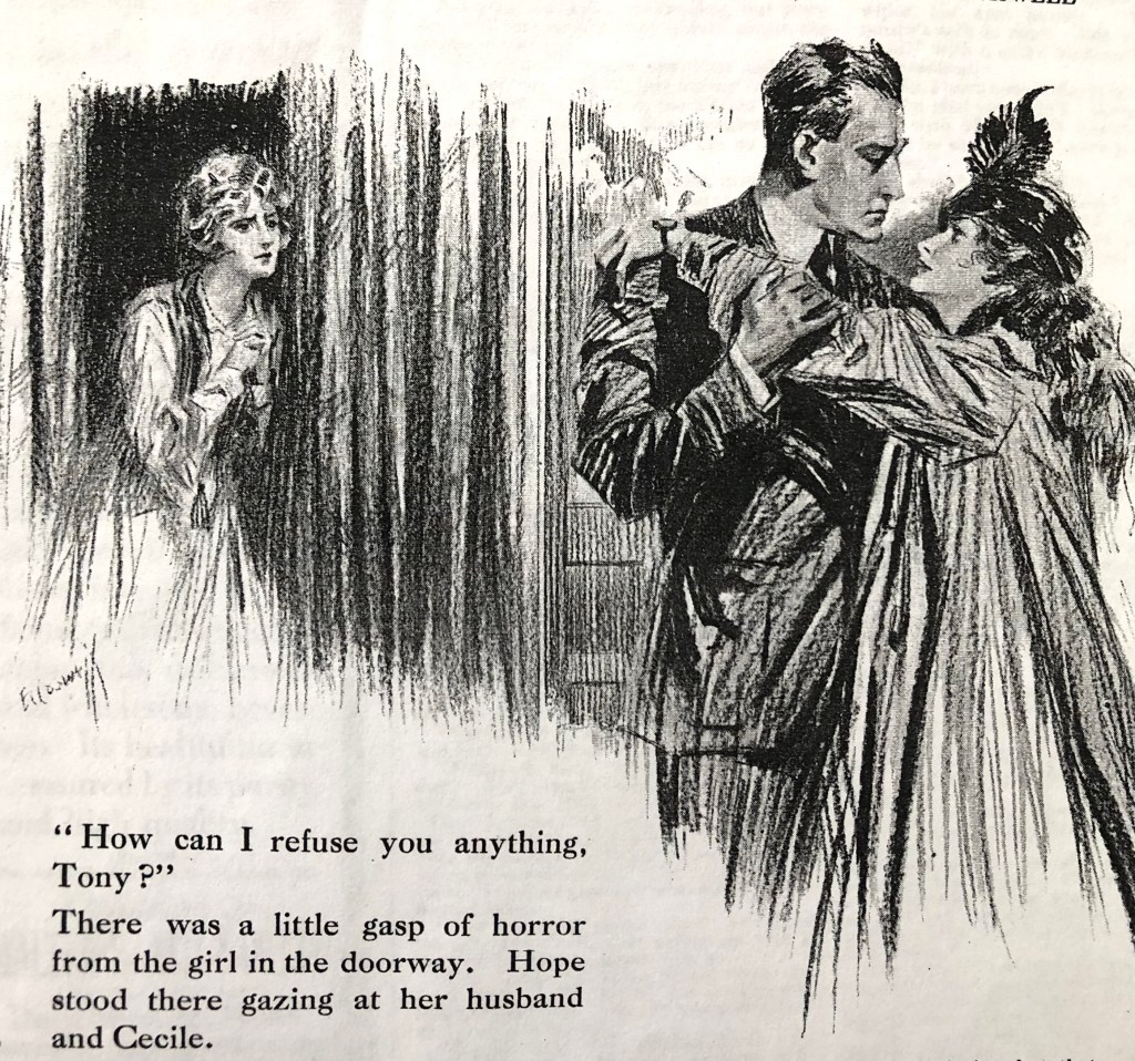 Summary of preceding chapters: A novel situation develops when after a ten minutes’ talk in the park with young Anthony Vance, whom she has never seen before, Hope Damon decides to marry him so that he may inherit his uncle’s great fortune which will be forfeited to Logan, Vance’s enemy, if Vance does not marry by noon of that day. Dicky Masson and lawyer Gilman are Hope’s staunch allies. Elsie Damon, Hope’s sister-in-law, and Cecile Talmadge, Logan’s sweetheart who jilted Vance for him, make Hope’s life miserable, and Gilman’s daughter, Barbara, is in love with Hope’s married brother, Dr. Jim. Hope decides to live with her husband in his Madison Avenue home and help him in his fight for the senatorship.