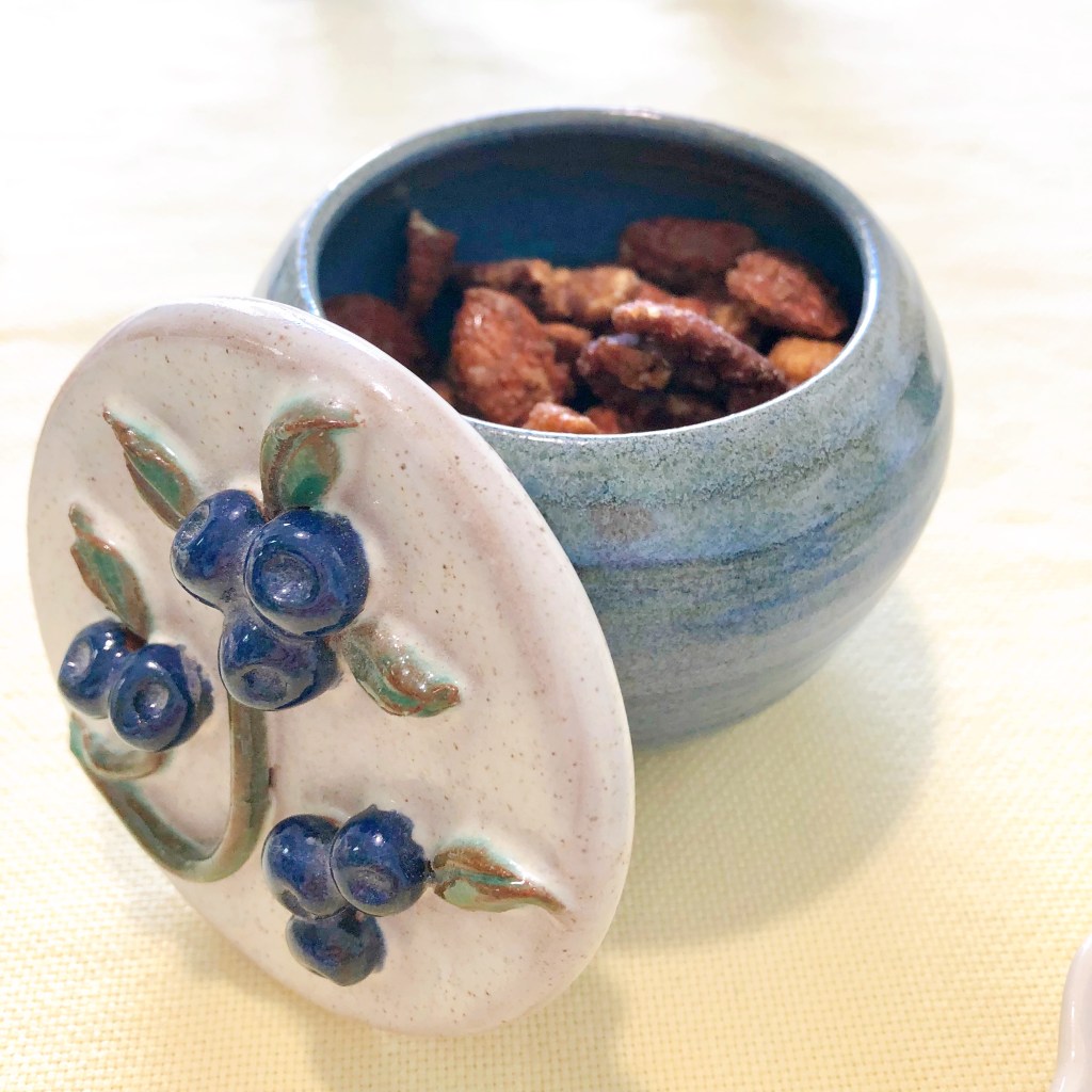 The blueberry-topped jar that I used for spiced nuts is not from Rackliffe Pottery, but from an older pottery in Blue Hill. Rowantrees Pottery opened in the early 1930s, the project of an eccentric, adventurous woman, Adelaide Pearson. Emilie Loring’s grandchildren took classes there, and it continued all the way into the early 2000s before closing for good. Rackliffe’s potters had worked at Rowantrees and adapted the popular blueberry-top design to their wares. Now that Rackliffe is closing, too, I wonder who will make the next blueberry-topped pots in Blue Hill.