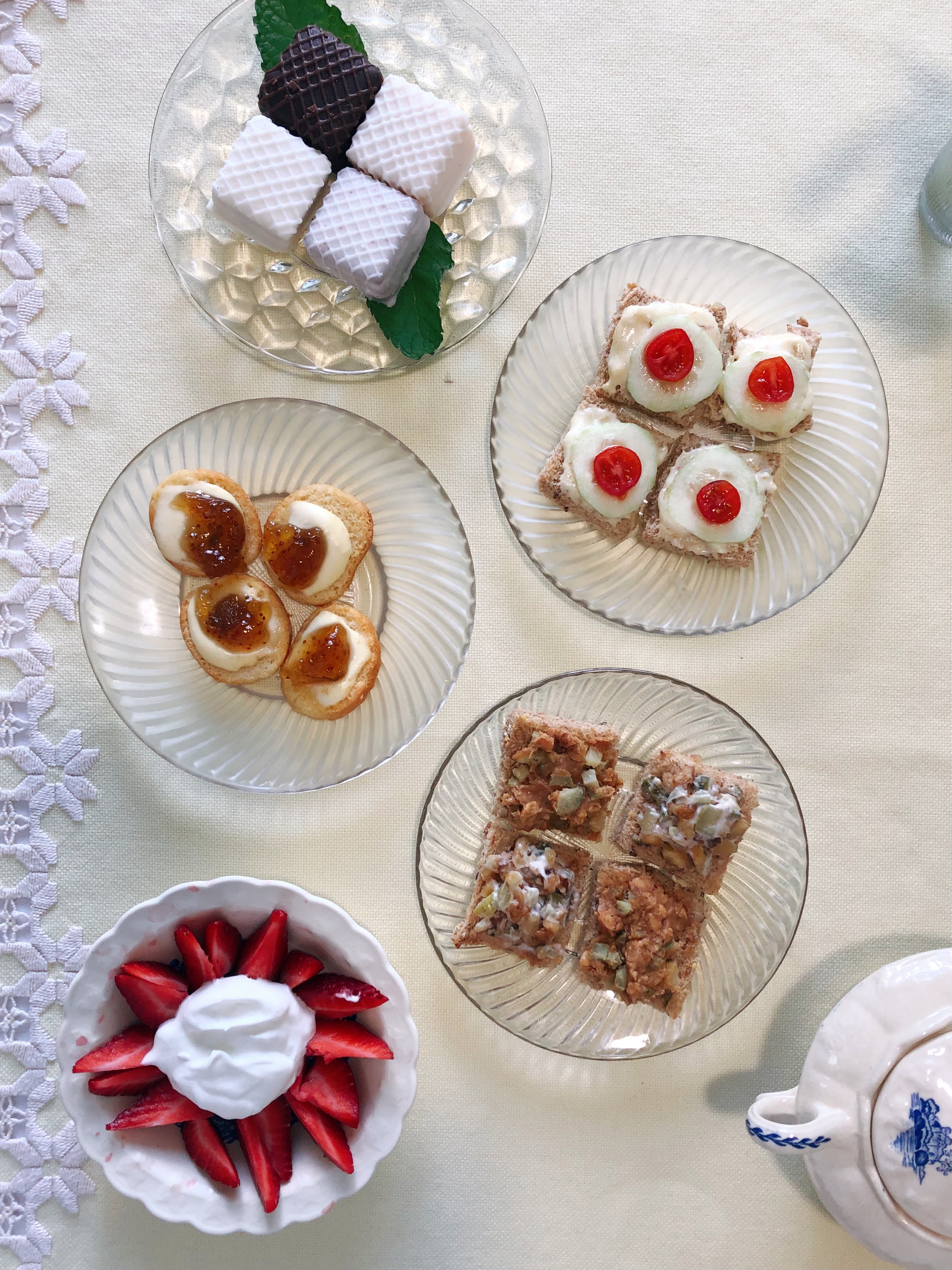 What’s tea without a couple of sweets to go with the savories? Mine were fresh strawberries with whipped cream and an array of petit fours from the local bakery. Those disappeared in a hurry!