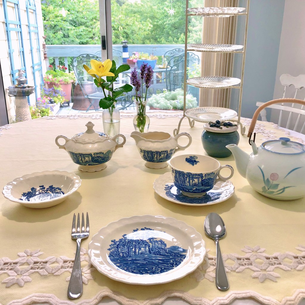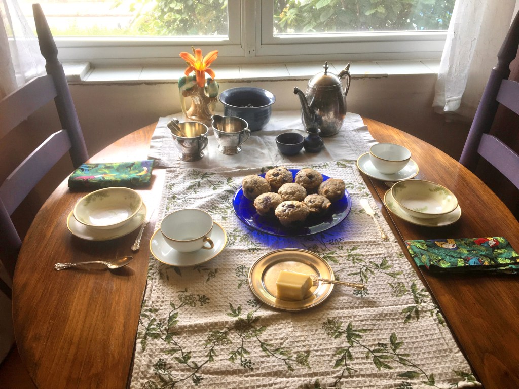 Emilie Loring would appreciate each element on Mary’s table. Those are blueberry ginger muffins on the platter, and the china and silver belonged to Mary’s grandmothers and great-great grandmother. Near the cheery daylily from Mary’s garden are several pieces of blue, Rackliffe pottery from Blue Hill, Maine–another Emilie Loring connection. Such a pretty setting for an afternoon tea!