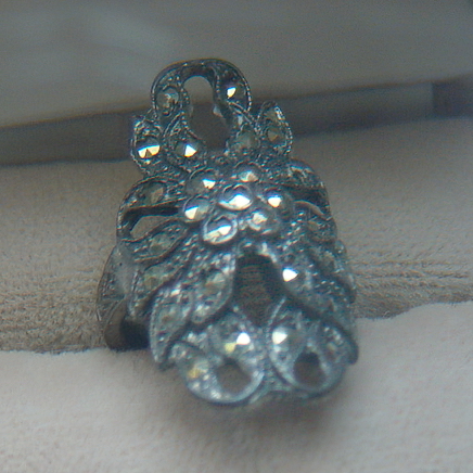 We know that Emilie liked her rings “splashy,” but this ring, nevertheless, spent a good deal of time on her right hand. I have found it in photos of her from several time periods. Does it look like a lobster to you?