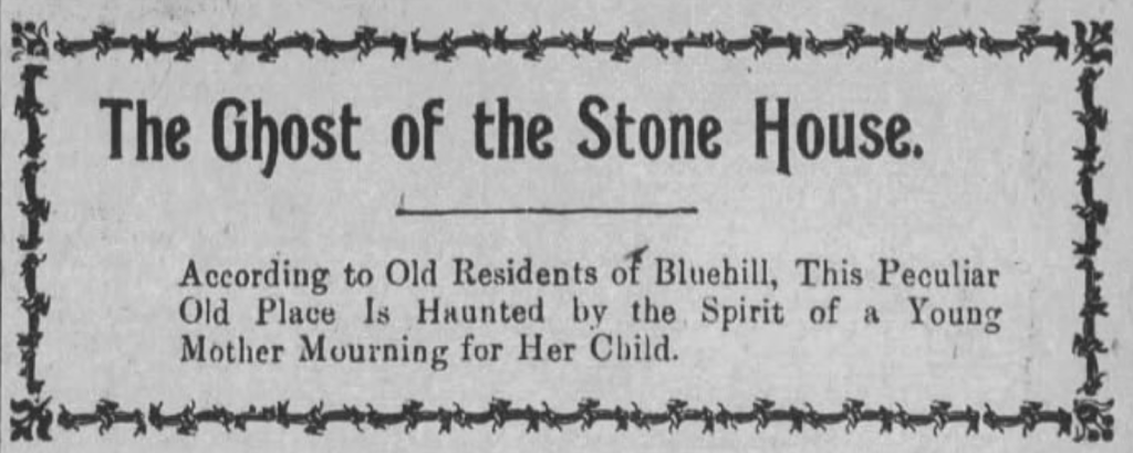 The old stone house, when I was a child, was a tavern and in those days had the reputation of being haunted, although few knew why, and few there were, could say that they ever saw the ghost. I remember one night that I went to Bluehill to attend a fancy ball and passed the night in the old stone house, as it was called. I had gone to bed after the ball, and to sleep. How long I had slept, I know not, but I was suddenly awakened by an unearthly scream in the room where I was sleeping.