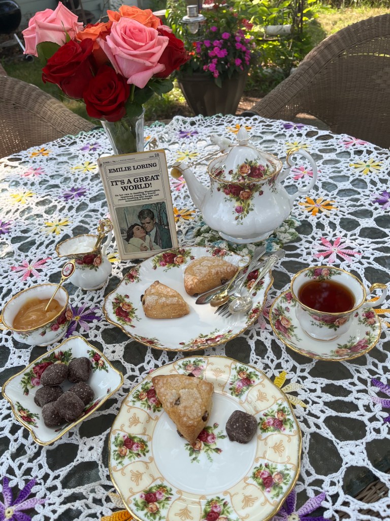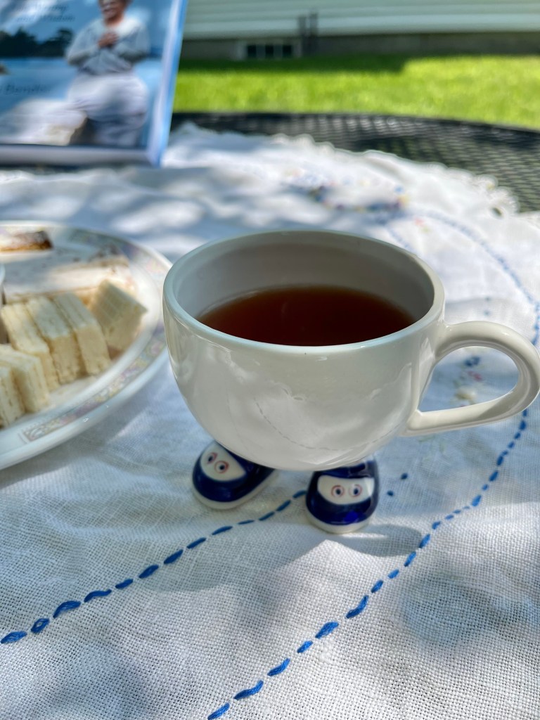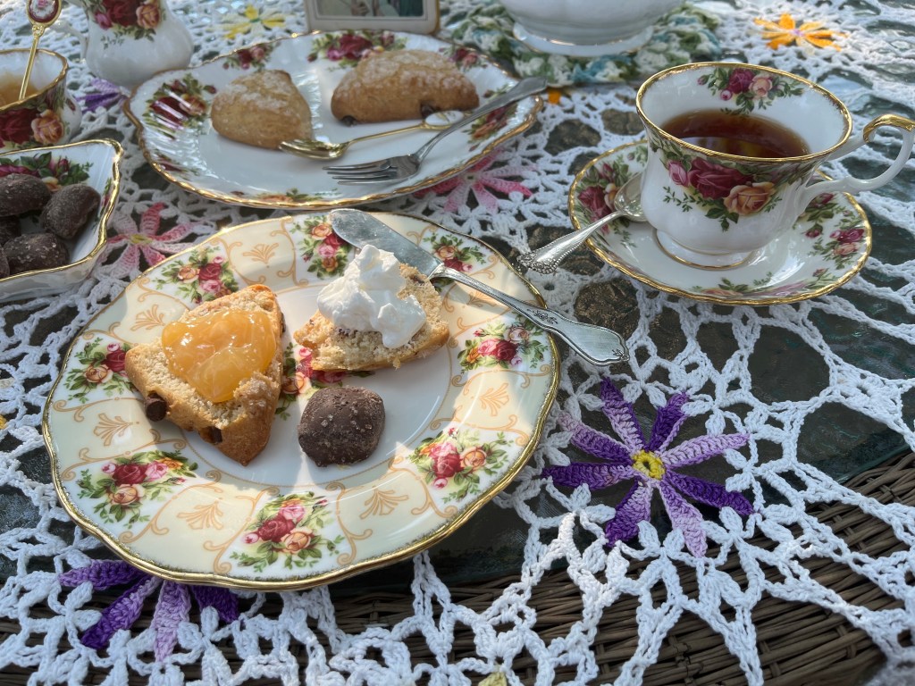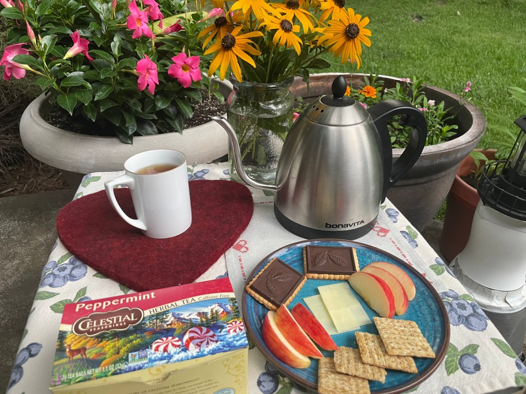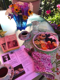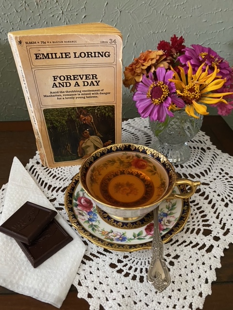 Elizabeth: “I am solo today as well. I had Coconut Macaron dessert tea in my favorite antique cup, with two of my dark chocolate squares. I went out to my garden to cut some zinnias to put in a vase to enjoy. I have one of my favorite books Forever and A Day to read again.”
