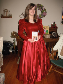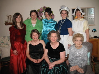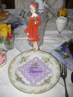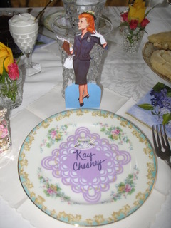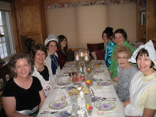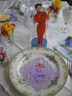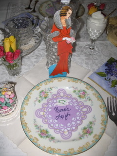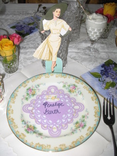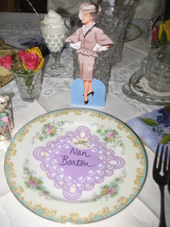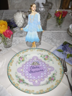 They set a lovely table to begin with, complete with fresh roses and floral china. But the fashion paper dolls! What an inspiration! Each guest wore her character’s costume, as you see below. I would love to have been there. Thanks for sharing your photos, Nancy!