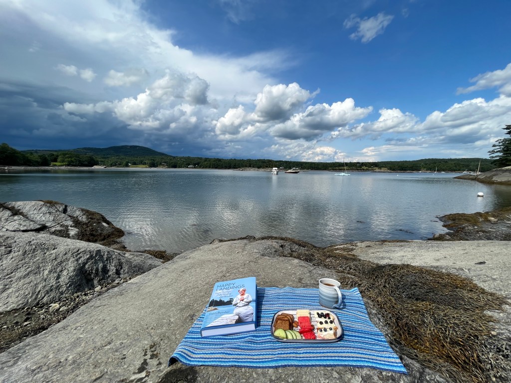 This is an all-Blue-Hill tea on the rocks. Happy Landings, of course, on a cloth by local weaver Jo Hewett and a mug by Lowell Pottery, which is continuing the designs of the old Rowantrees Pottery of Emilie’s day. I found both cloth and mug at a great little shop, “Handworks” in Blue Hill.