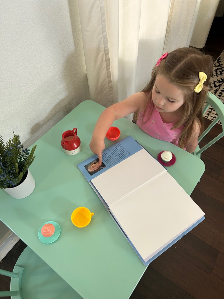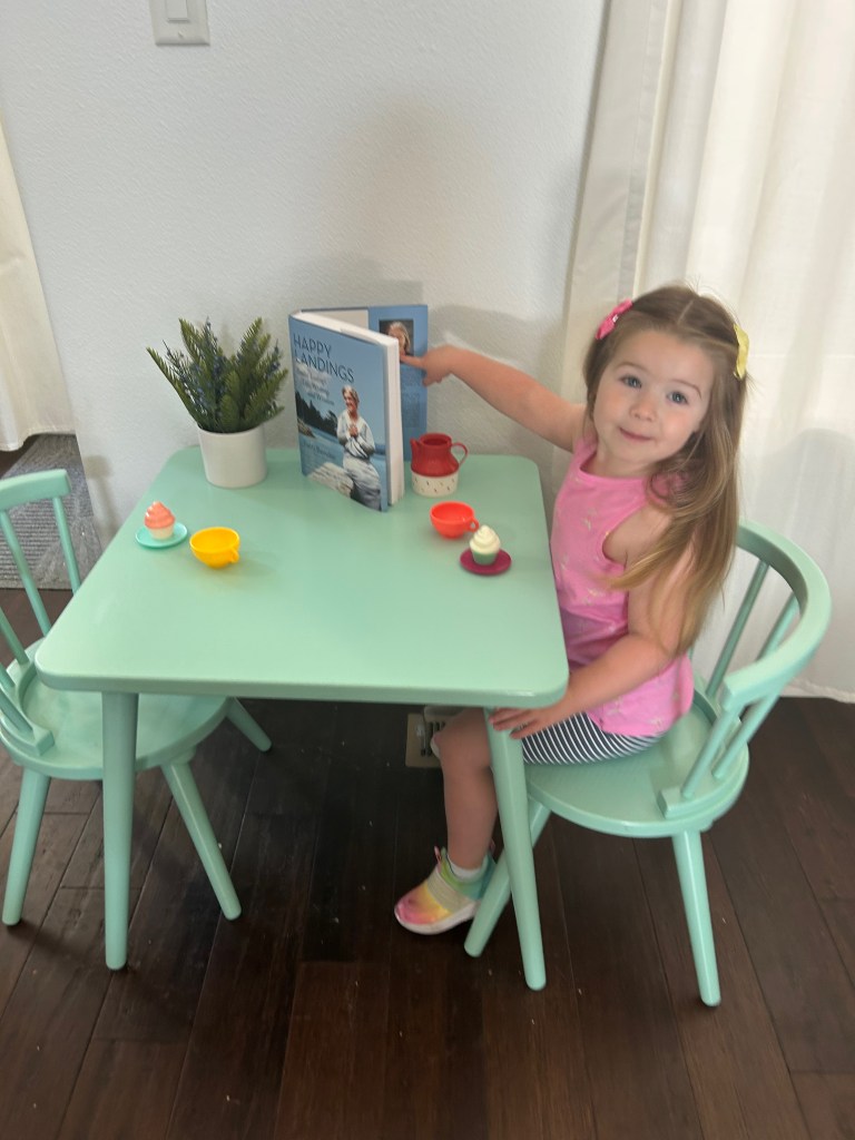 Granddaughter Molly served pink and white (plastic) cupcakes for her tea. When asked to show her favorite part of Happy Landings, she pointed to my photo on the inside back cover. “Grandma!”