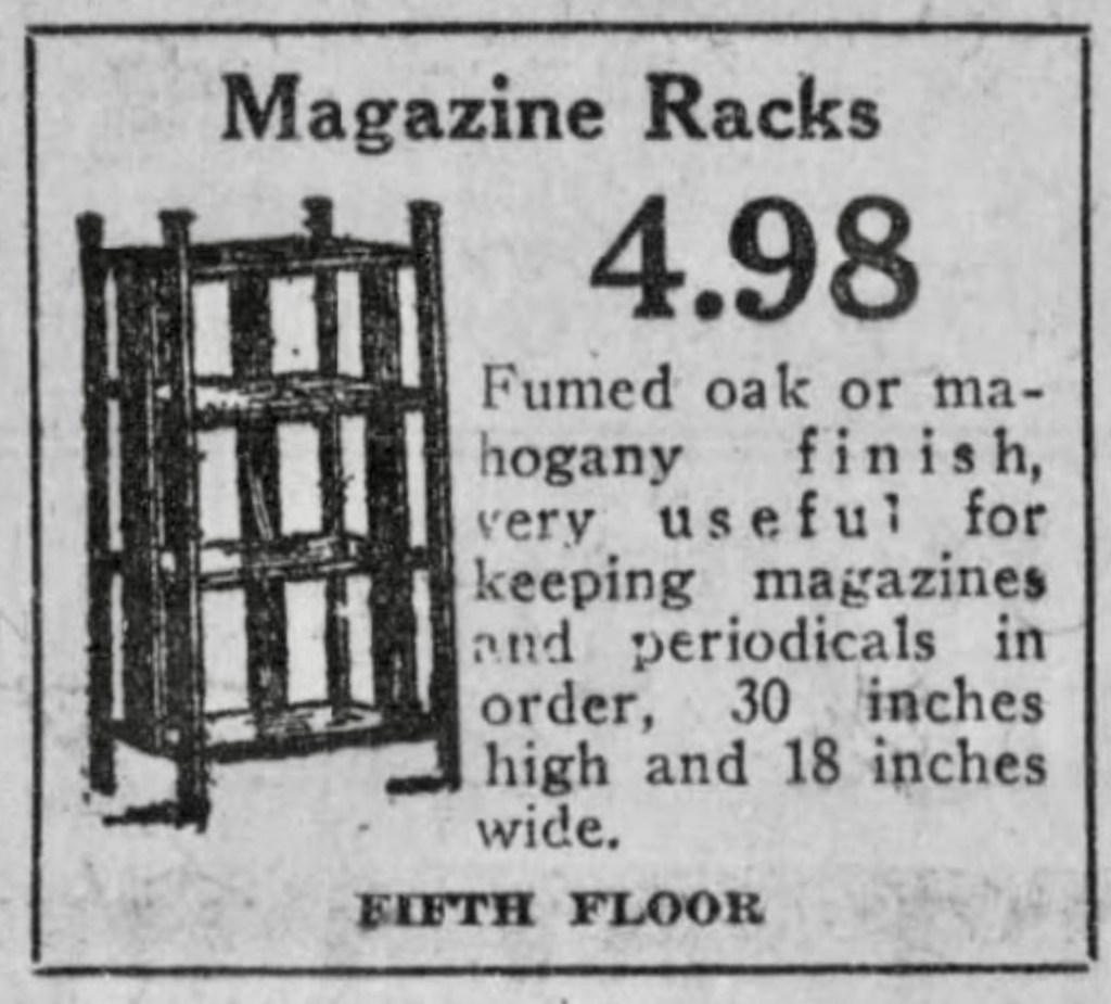 A magazine rack! We have the twin of this set of shelves in our lake-house basement, and we’ve used it as a bookshelf for as long as I can remember. Today, it stores my Grandpa’s volumes of Popular Mechanics’ Home Handyman. Now, I’m imagining it loaded down with HOLIDAY, LIFE, and LOOK magazines.
