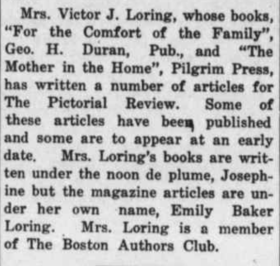 Honestly, I have no idea. She’s identified here by her relationship to her brother, Robert, who was a professional writer for the musical stage. But why not ask him? Maybe it was as simple as her being available for a reporter who was on deadline. In any case, this event did not find a place in Happy Landings: Emilie Loring’s Life, Writing, and Wisdom. It took this bit of sleuthing, though, before I could decide.