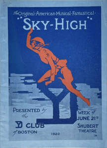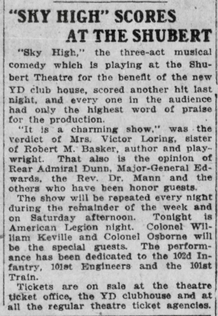 Sky High was an original, amateur production with lyrics by Leverett D. G. Bentley, a reporter for the Boston Globe, and music by Albert M. Kanrich. The cast was all amateurs, except C. B. Pettes, “the premier female impersonator of the American Expeditionary Forces.” My first thought was the Shubert Theatre in New York, but this performance was scheduled for the Shubert Theatre in Boston.