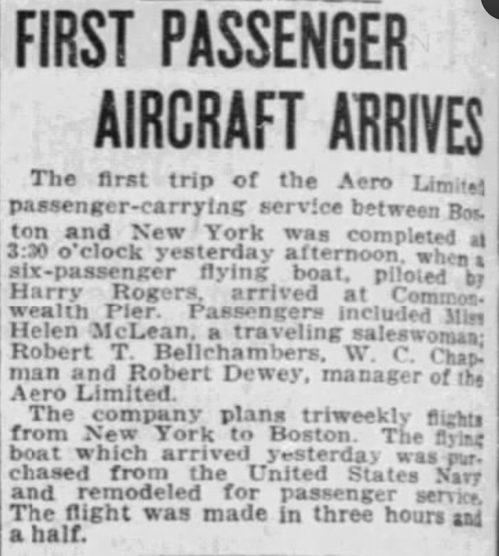 The first trip of the Aero Limited passenger-carrying service between Boston and New York… a six-passenger flying boat, piloted by Harry Rogers, arrived at Commonwealth Pier. . . . The flying boat which arrived yesterday was purchased from the United States Navy and remodeled for passenger service. The flight was made in three hours and a half.