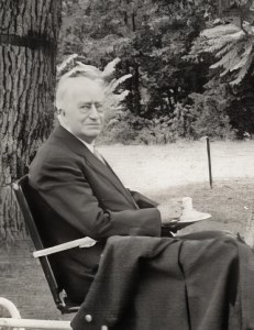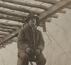 Here is Victor in an unguarded moment. He sits atop a ladder beneath the grape arbor at Wellesley Hills, holding a pair of clippers in his right hand. It was a chilly day; his hat brim is pulled down, and his collar is turned up. We’ve all had photos taken of us in mid-expression. I don’t suppose Victor ever imagined that his would be published for all to see. Nevertheless, someone (Emilie? Selden?) thought enough of the moment to capture it on film.
