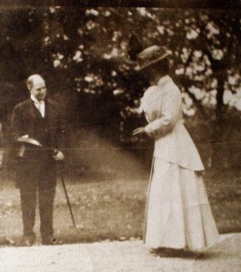 In contrast is this “Congratulations” photo that appears fully in Happy Landings: Emilie Loring’s Life, Writing, and Wisdom. Perspective provides an artistic emphasis: Emilie was on the cusp of success, “bigger” in that moment than Victor. He is dapper, his hat offered in respect and congratulations, his head tilted in affection.