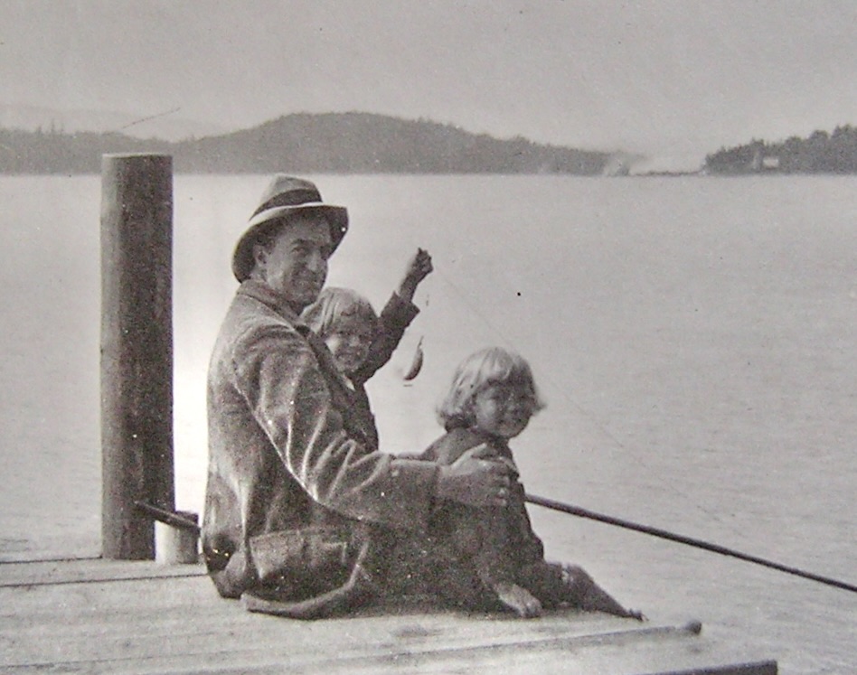 I love this photo of Victor fishing with his sons at the Rangeley Lakes. His hat is crumpled, his coat worn and shabby. Robert caught a fish–“Look! I got one!”–and they’ve all just turned to smile and document the moment on camera. In the next photo, Selden rides on Victor’s shoulders, wearing his Papa’s broad-brimmed, hiking hat–relatable events in the life of a dad with small boys.