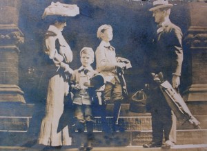 I was sorely tempted to use this family photo in Happy Landings, as it is a rare photo of all four of them together. I held off, because I didn’t have enough contextual information for it. The boys have had their hair cut short since the Rangely photos. Perhaps they are going to school, but what of the short golf clubs that Victor is carrying? This could be about 1902, when Robert was seven and Selden five. Massachusetts readers, do you recognize this location?