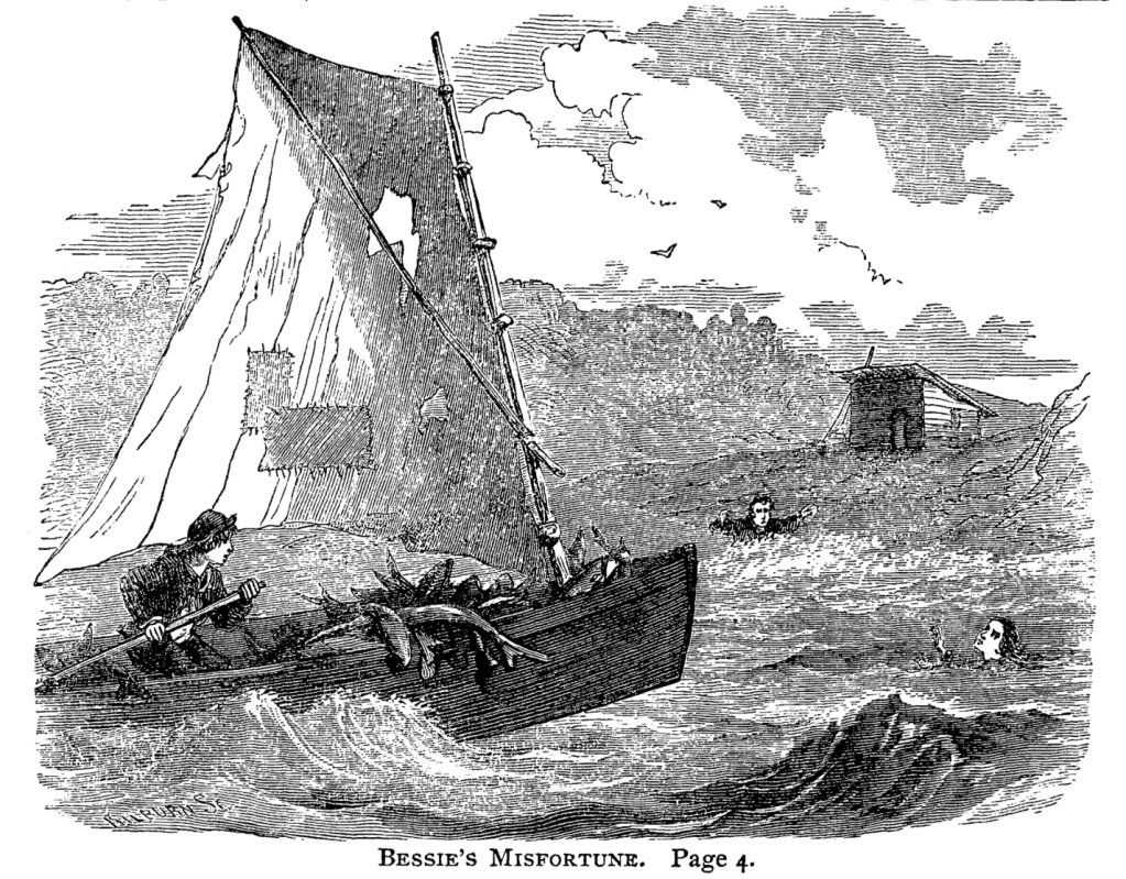 As “The Starry Flag, or The Young Fisherman of Cape Ann” begins, Bessie Watson wheedles her father to allow her just one more swim before they leave the coast and return to the city. Bit by bit, she goes too far from shore, and her father, who swims poorly, is unable to follow. (I perked up immediately when I saw “Bessie.” I am ever on the lookout for how Emilie gained her nickname.)