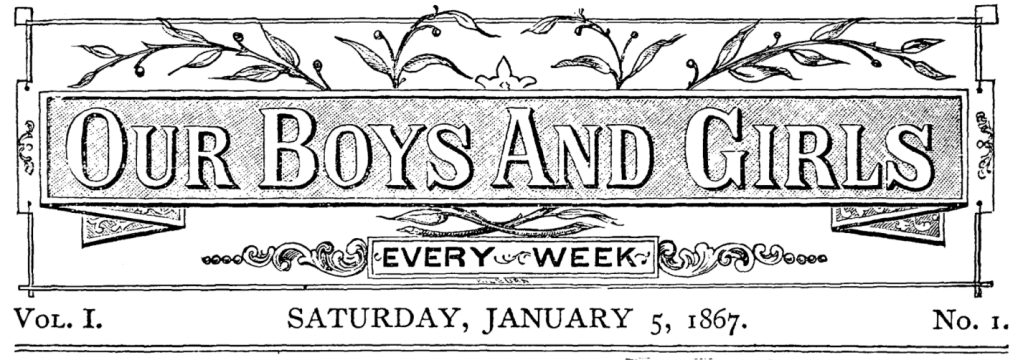 This advanced level of reading gave Emilie’s father and Oliver Optic a wide range of literary possibilities when they created their magazine for children, Our Boys and Girls, only a few months after Emilie’s birth. I’m impressed with the respect that they gave their young audience.
