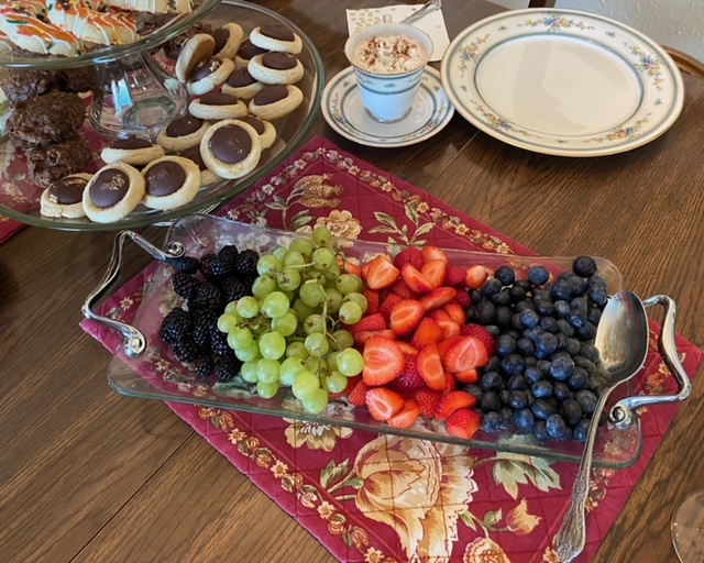 “Dessert we kept simple with 3 different mini cookies and strawberries, blueberries, grapes and blackberries.Two of us drank tea, one had hot chocolate, and two had a Coke.”