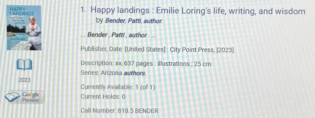 After returning home, I checked online at the Tempe Public Library to see if there had been any change in the call number for Happy Landings: Emilie Loring’s Life, Writing, and Wisdom. There had! Good job, librarians, and thank you, Jerry at the Answer Desk, for pursuing it.