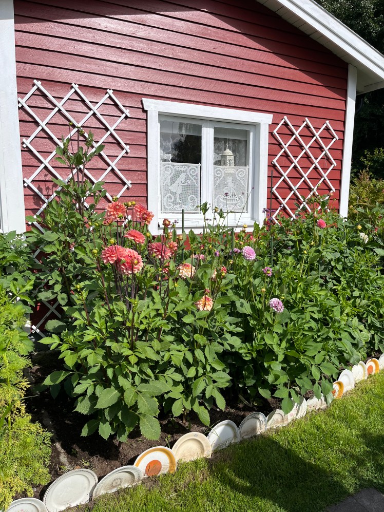 This is the first time I have ever seen dinner plates used as a border for a flower garden. (Dahlia garden photo) What a great idea for using old plates!