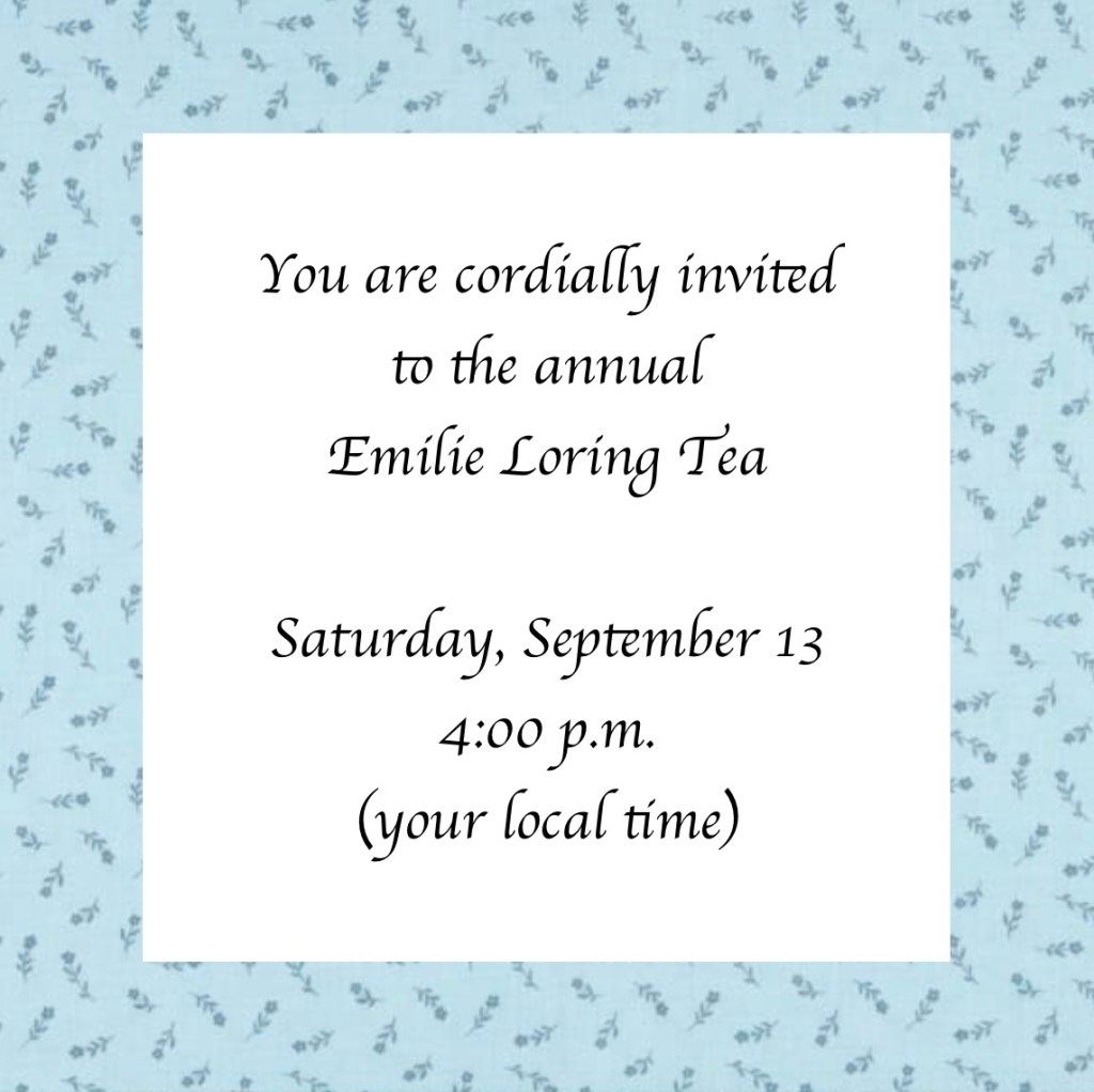 Emilie Loring’s birthday is this Friday, September 5. If that works for you, great! If you’d like more time to set your scene and invite friends over, then please take it. I’ll begin collecting photos whenever you send them, with our “official” tea time set for Saturday, September 13th, at 4:00 p.m. your local time.
